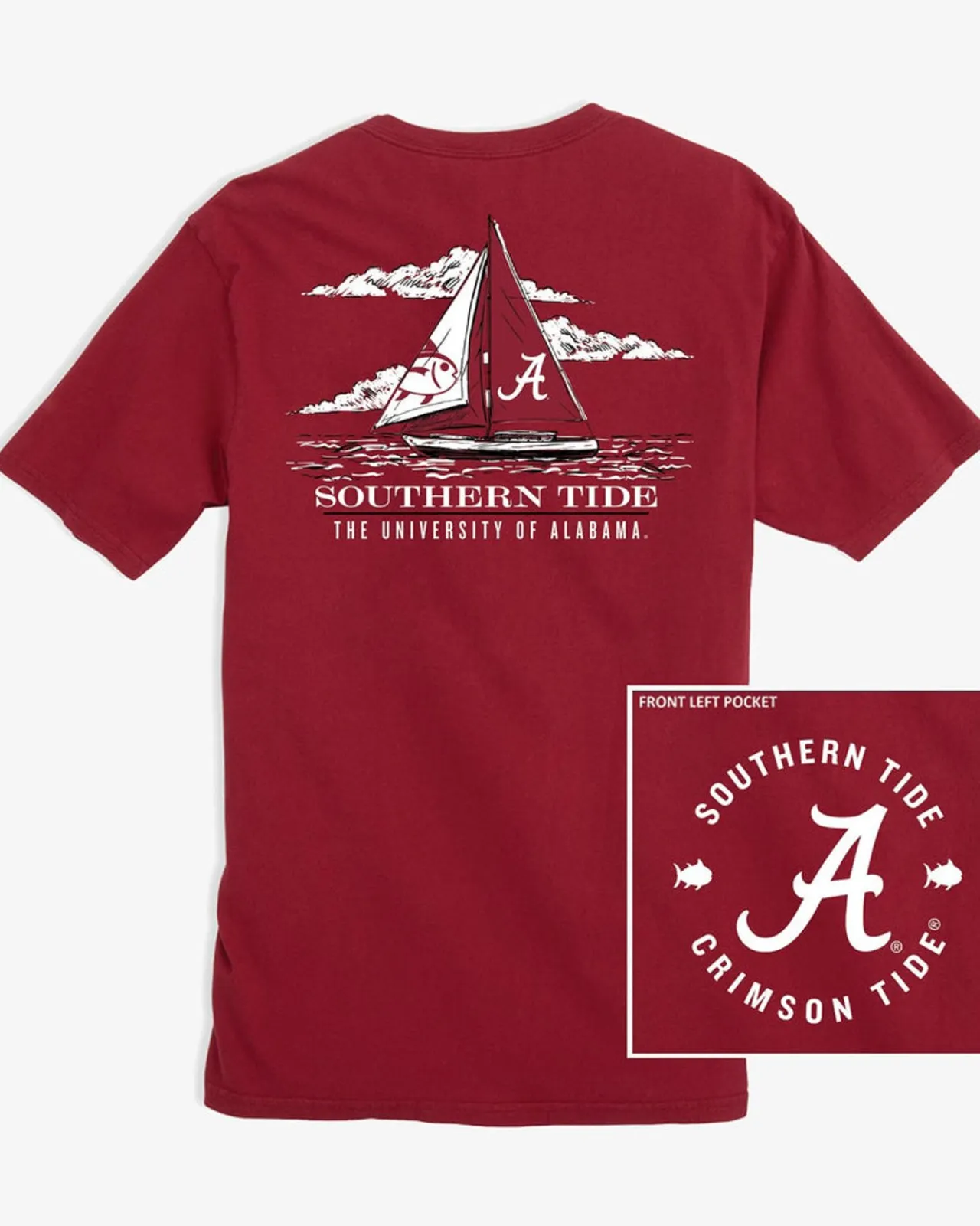 Our Southern Tide Collegiate Short Sleeve T-Shirt Is A Great Addition To Your Casual Wardrobe. This Shirt Features A Sailboat Scene On The Back With The Alabama Crimson Tide Logo And A Front Chest Pocket, Making It A Stylish Way To Show Off Your School Spirit. Made With Our High-Quality Cotton Blend Fabric, It’S Designed For Both Comfort And Durability. Whether You’Re Cheering On Your Team Or Hanging Out With Friends, This T-Shirt Is An Excellent Addition To Your Collegiate Collection.