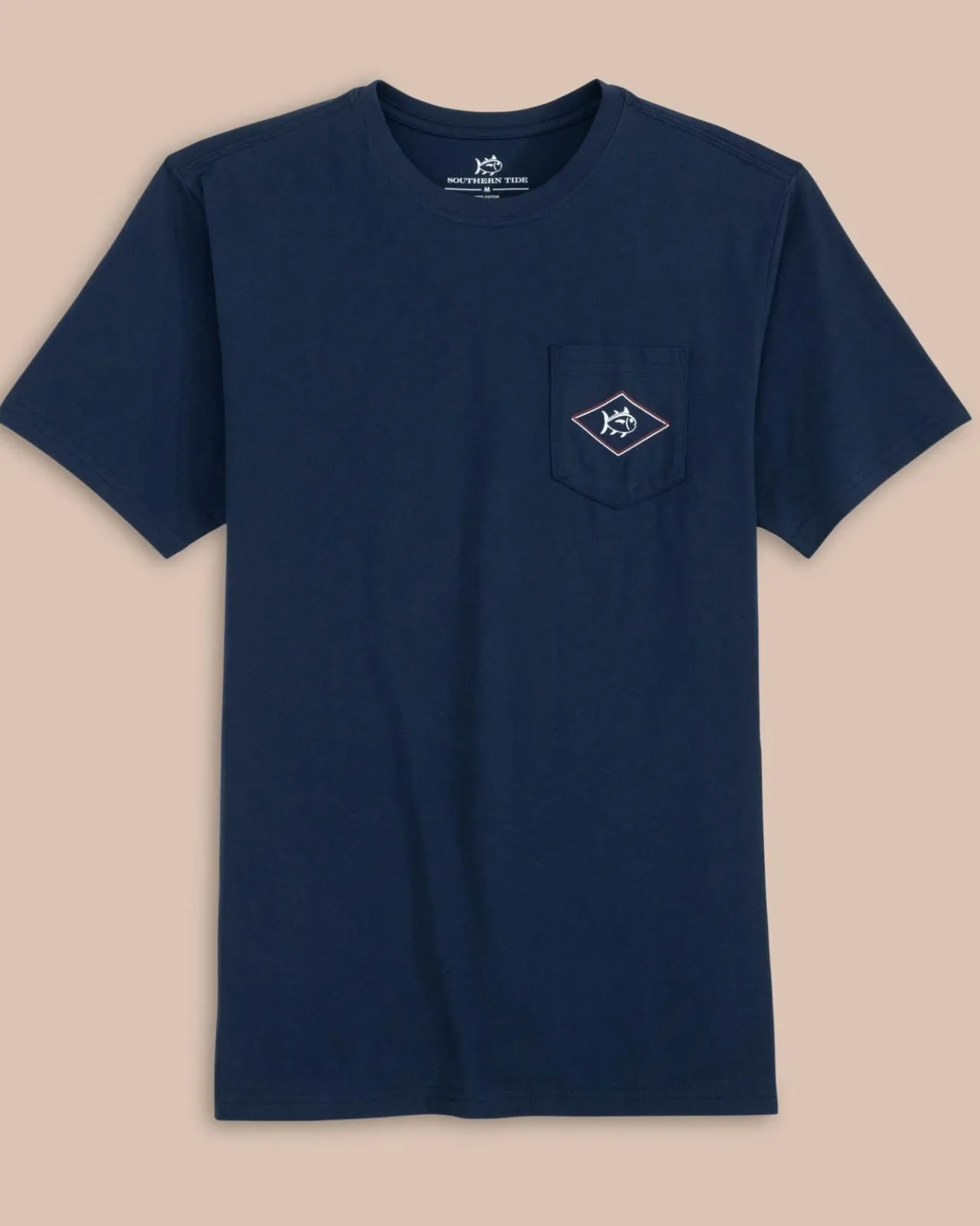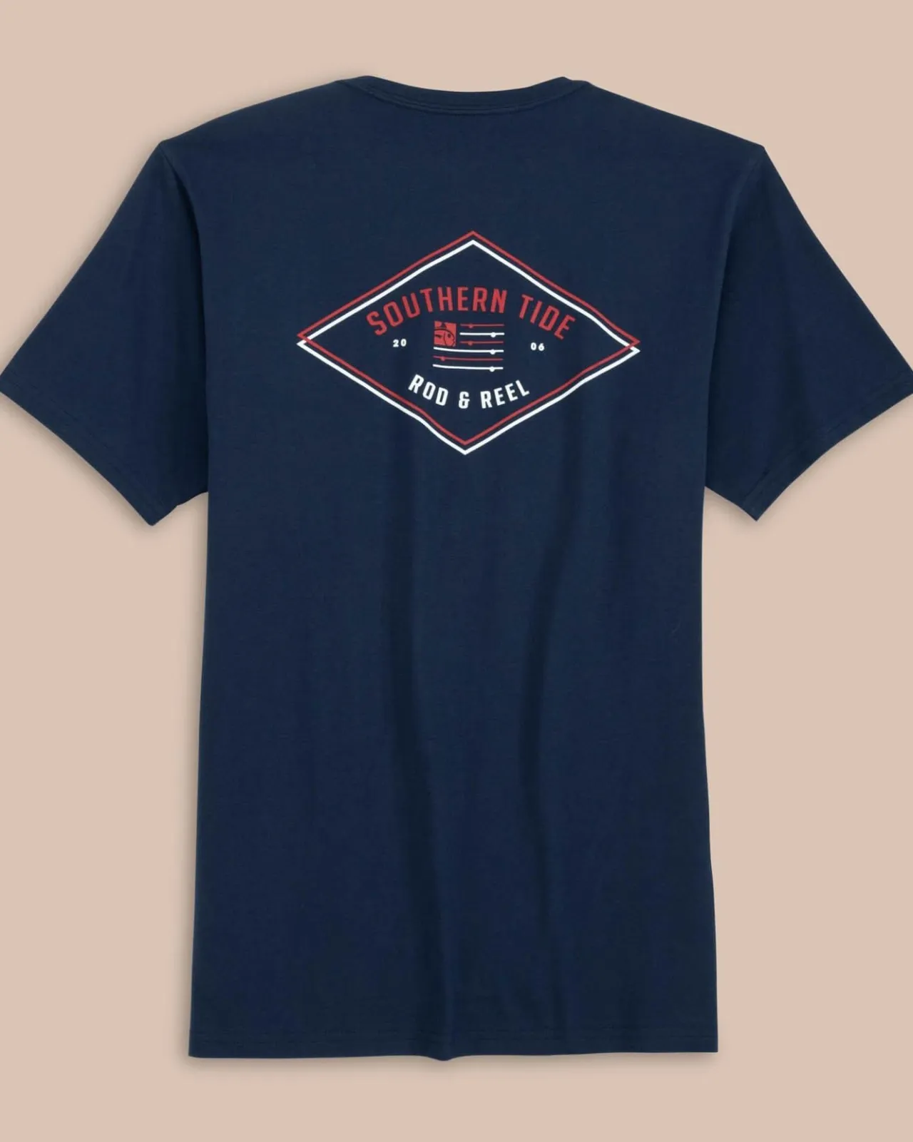Pledge Your Allegiance To The Sport Of Fishing With The Rod-And-Reel Flag Design On This Classic Cotton Tee. This Short-Sleeve Shirt Features A Small Chest Graphic And A Larger Back Graphic. It Is Also Available In Youth.