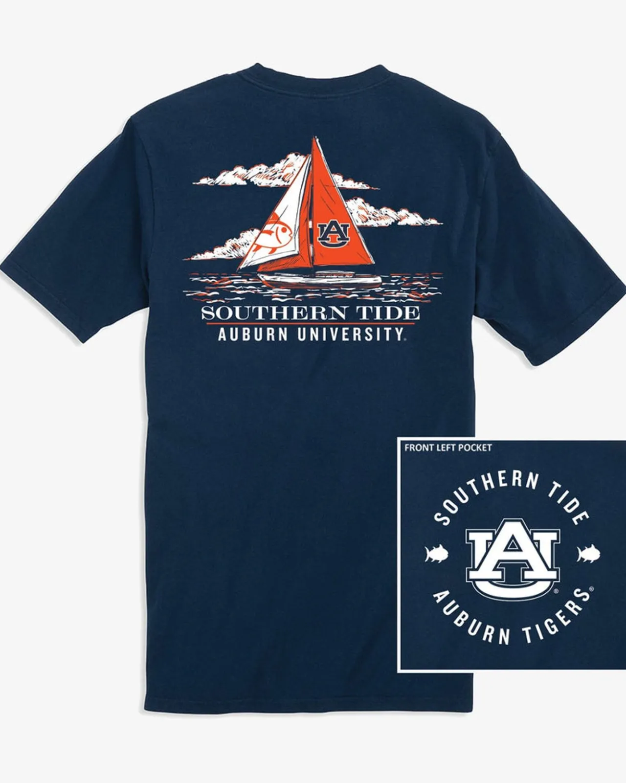 Our Southern Tide Collegiate Short Sleeve T-Shirt Is A Great Addition To Your Casual Wardrobe. This Shirt Features A Sailboat Scene On The Back With The Auburn Tigers Logo And A Front Chest Pocket, Making It A Stylish Way To Show Off Your School Spirit. Made With Our High-Quality Cotton Blend Fabric, It’S Designed For Both Comfort And Durability. Whether You’Re Cheering On Your Team Or Hanging Out With Friends, This T-Shirt Is An Excellent Addition To Your Collegiate Collection.