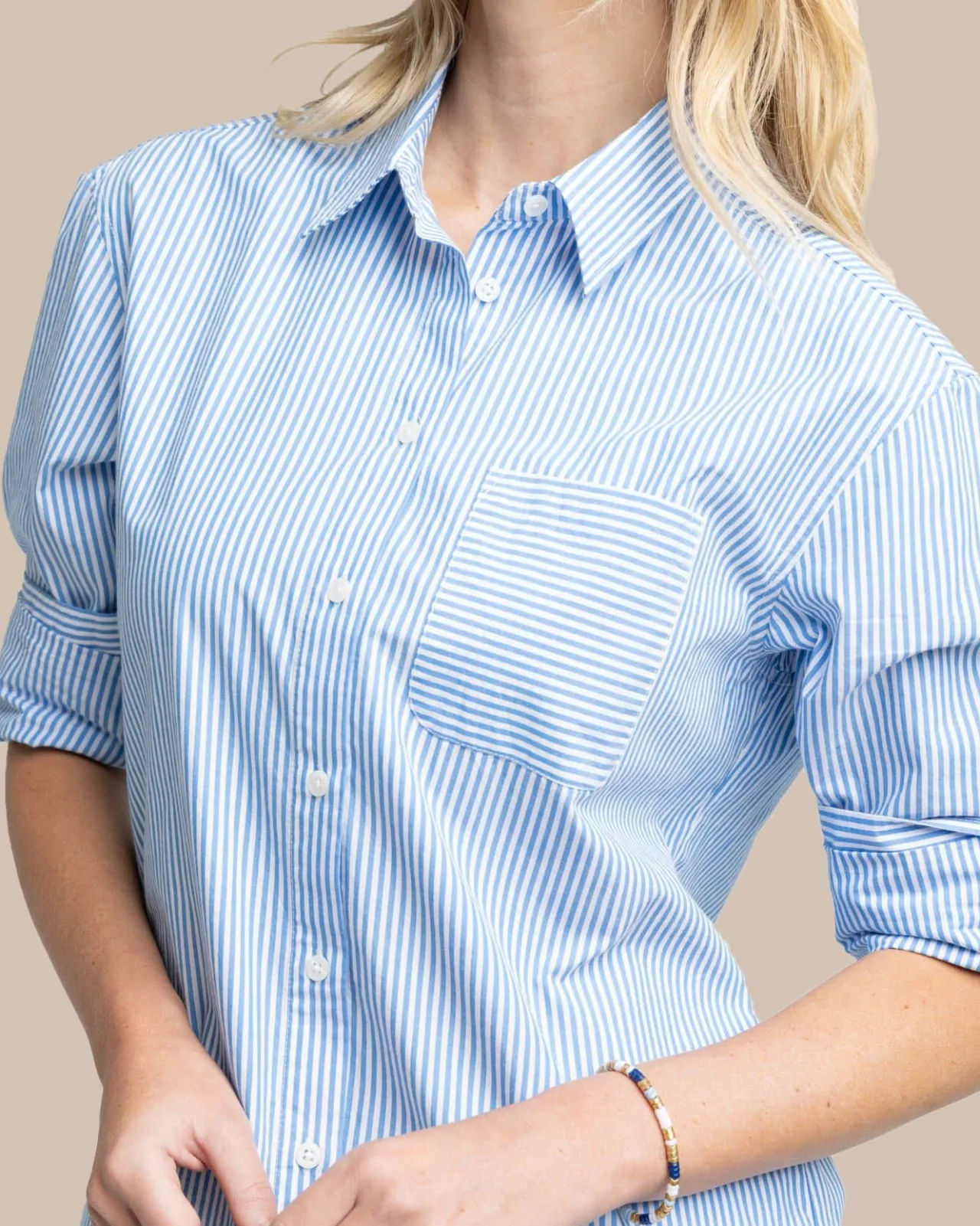 Oceanside Meets Office Wear In Our Professional And Preppy Poplin Dress. We Took The Basic Striped Button-Down And Designed It As A Long-Sleeve Dress With Roll Cuffs And A Curve Hem Detail To Keep Your Look Polished.