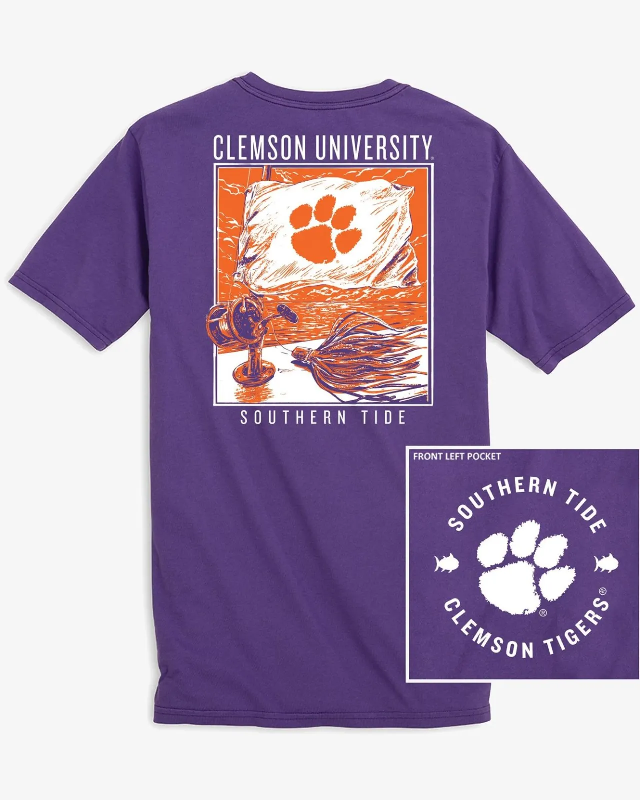 Combine Your Two Favorite Pastimes With Our New Collegiate Short Sleeve T-Shirt. Featuring A Fishing Reel And Boat Flag Design With The Clemson Tigers Logo On The Back And A Front Chest Pocket With The School Logo, This Shirt Is The Perfect Way To Show Off Your School Spirit And Love For Fishing. Made With Our High-Quality Cotton Blend Material, It’S Comfortable For All-Day Wear, Whether You’Re Cheering On Your Team From The Sidelines Or Backyard Tailgate.