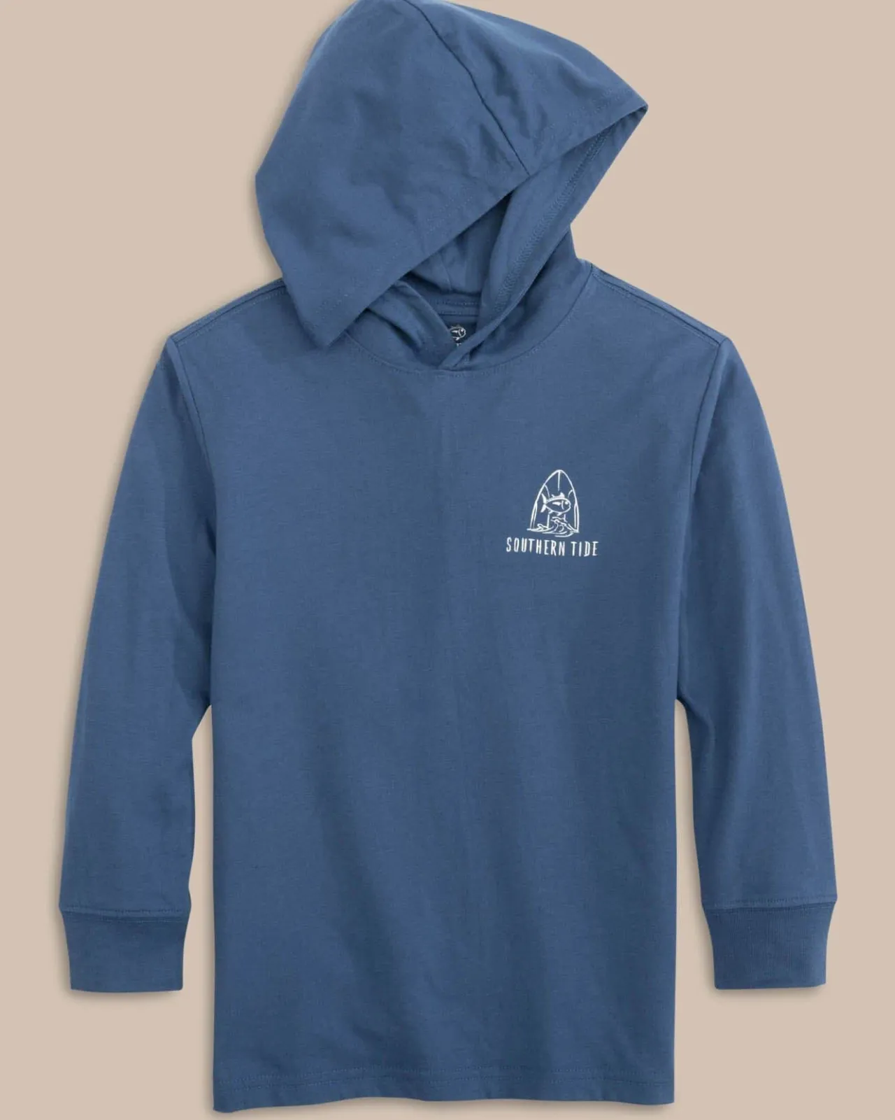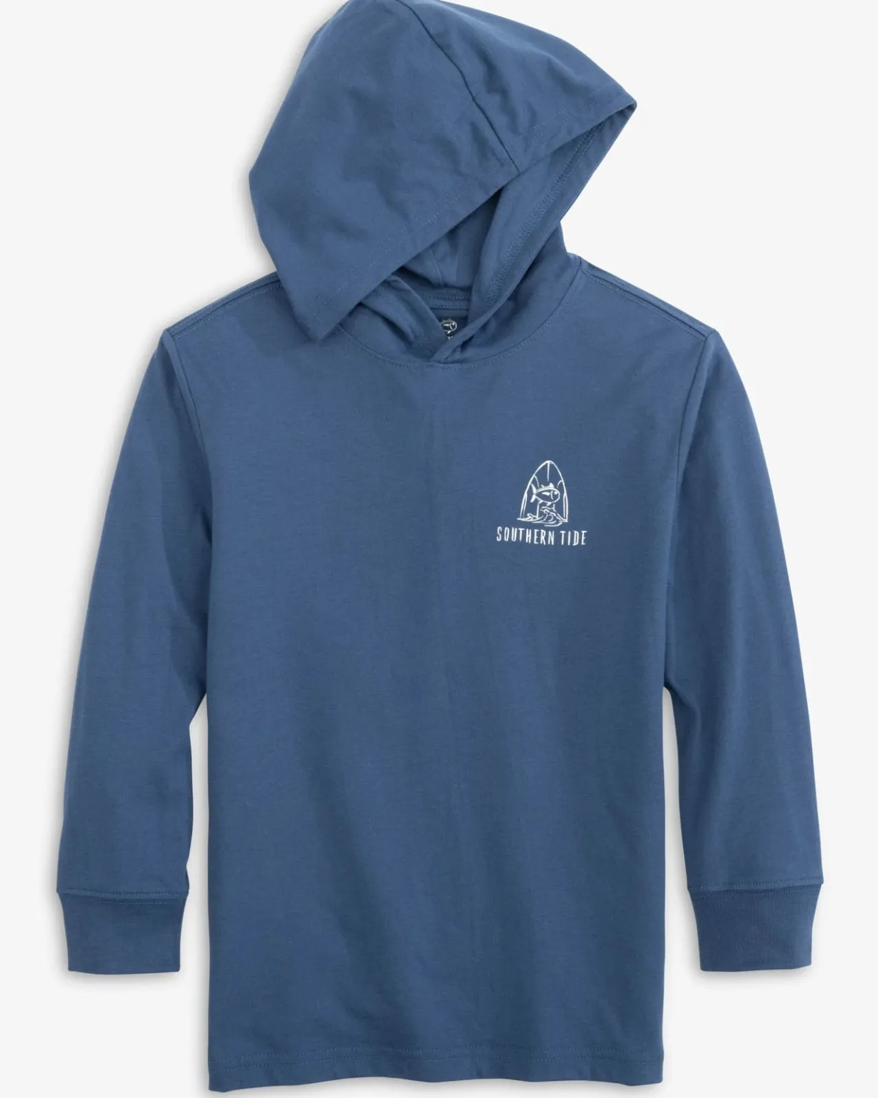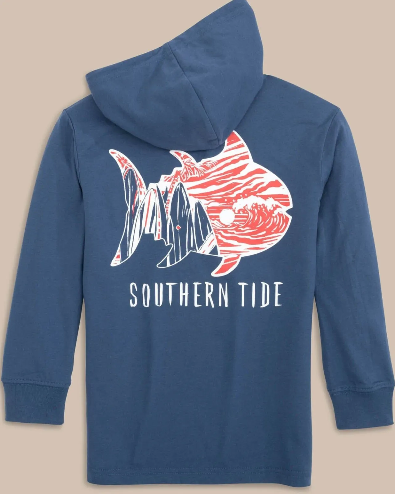 Hang Loose In The Youth Surfing Skipjack Ls Hoodie T-Shirt. The Back Graphic Features A Skipjack Who Swallowed A Sunset Paddle In The Surf.