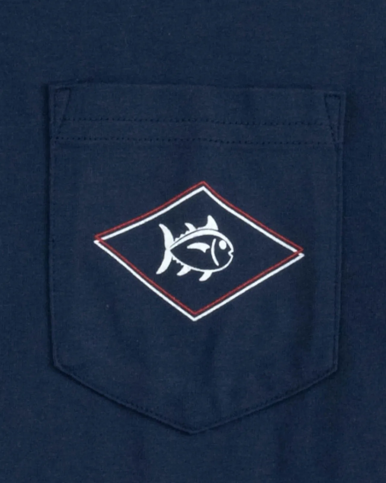 Pledge Your Allegiance To The Sport Of Fishing With The Rod-And-Reel Flag Design On This Classic Cotton Tee. This Short-Sleeve Shirt Features A Small Chest Graphic And A Larger Back Graphic. It Is Also Available In Youth.